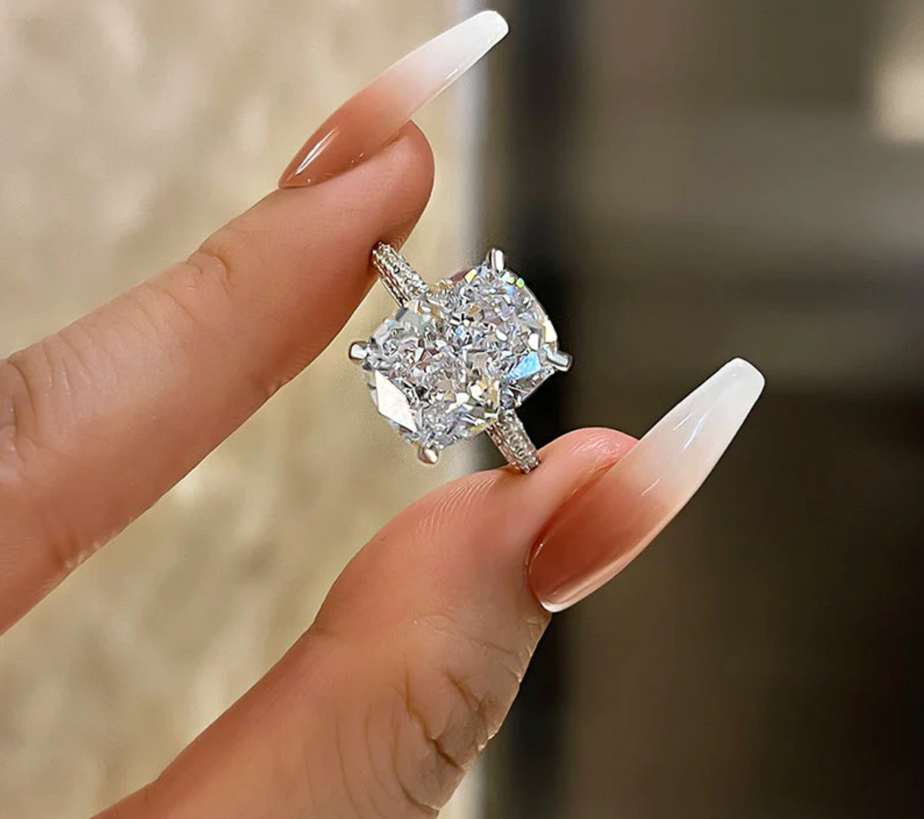 This exquisite ring is individually crafted upon request, making it truly special to you. Featuring a stunning 10.0 carat cushion-cut lab-created white gemstone set securely in a classic four-prong design, it radiates brilliance from every angle. The centerpiece is complemented by delicate round side stones totalling 0.5 carats, enhancing the sparkle without overpowering the main gem.